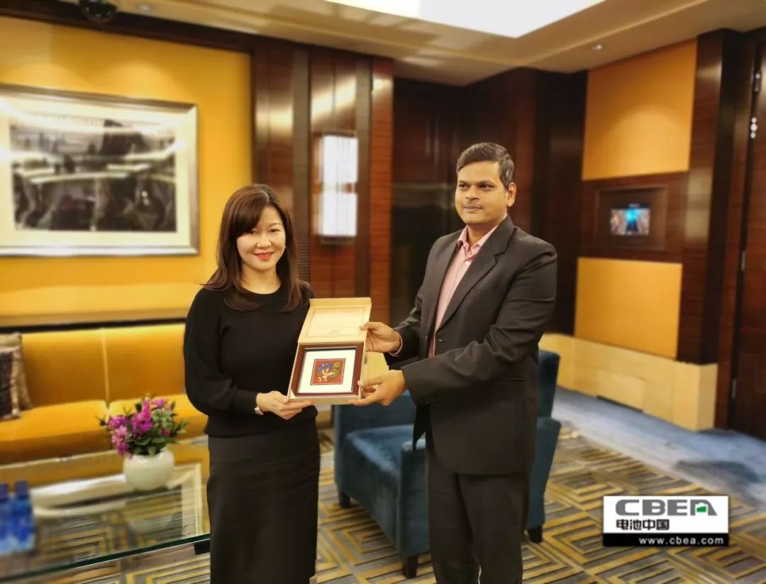 圖為張雨代表動力電池應用分會接受印度泰米爾納德邦國家產業振興局常務董事(副部長級)庫瑪拉古魯巴蘭 贈送的禮物——印度泰米爾納德邦傳統民間工藝品“吉祥鳥”
