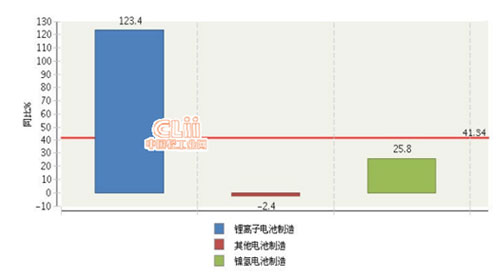 從全行業(yè)看,鋰離子電池制造業(yè)利潤總額同比增長較快,鋰離子電池制造業(yè)完成累計(jì)利潤額占比52.24%,同比增長123.39%。